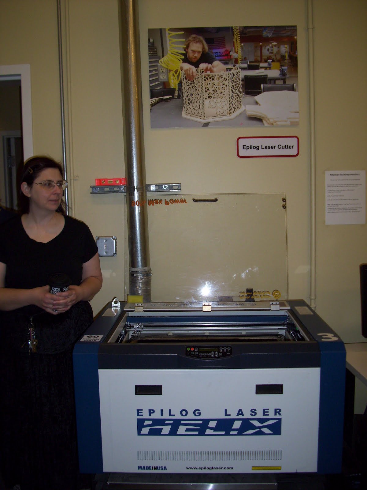 They have a woodworking shop, a metalshop, a 3D printer... all sorts of amazing things. Here's Kathryn next to the laser cutter that lets her make her gorgeous gears: